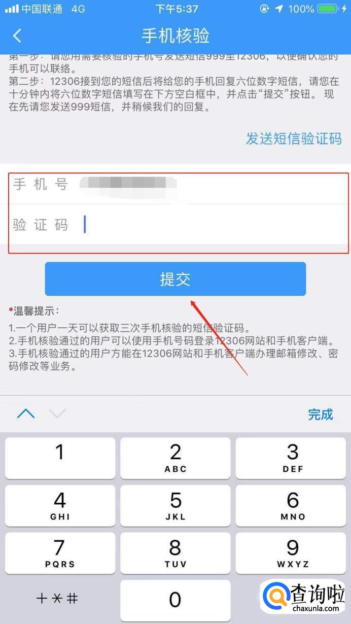 返回手机核验界面,输入你的手机号和验证码点击“提交”就可以了。