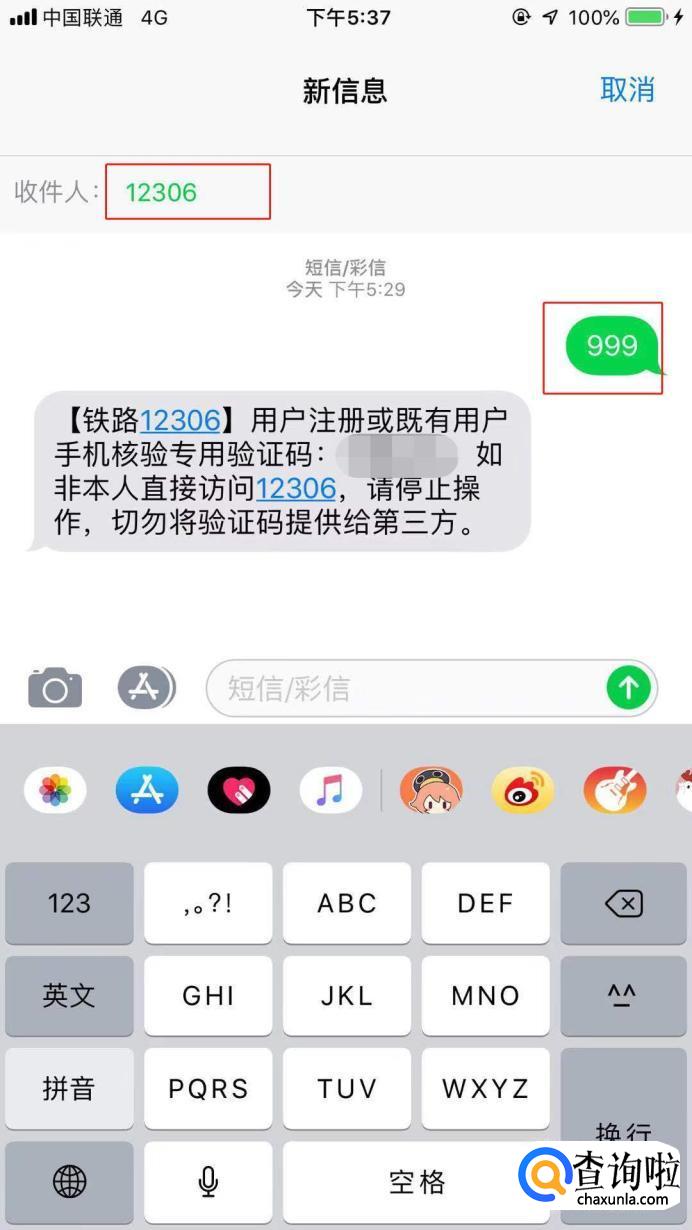 然后打开短信,向“12306”发送“999”,就会收到一个验证码。