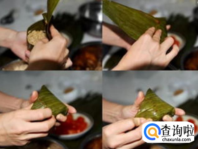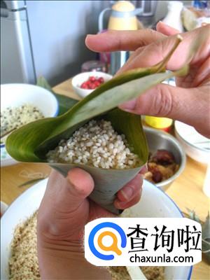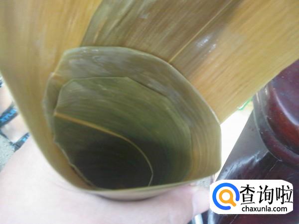 配料准备齐全后,我们就可以包粽子了,先将粽叶卷成漏斗形状。
