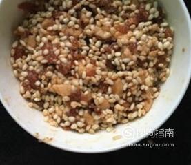 加入少许糯米,再加入咸蛋黄,在咸蛋黄上放一块五花肉,最后用糯米填满。