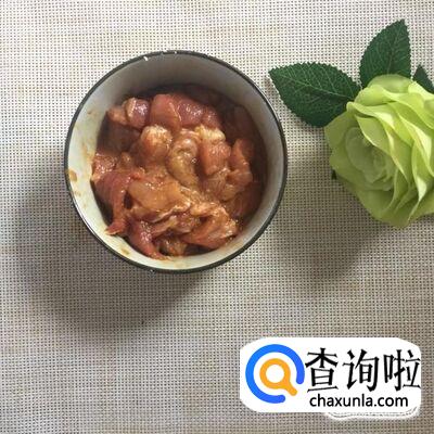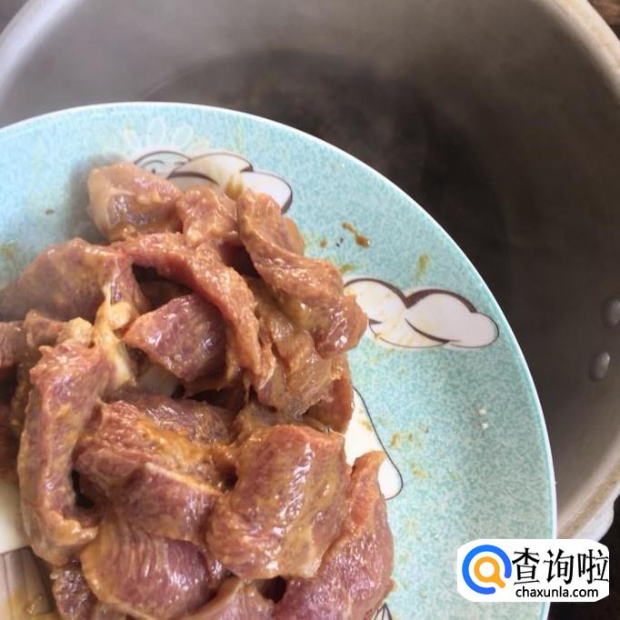 然后把瘦肉切成薄片并用适量的地瓜粉和酱油裹一下,倒入锅中煮3分钟。