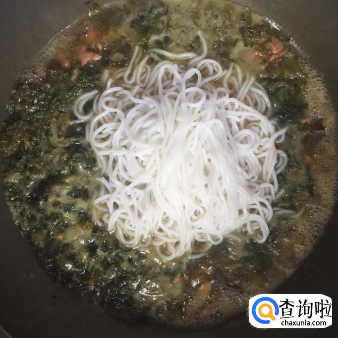 接着把事先烫好的粉干倒入锅中,开大火煮三分钟。