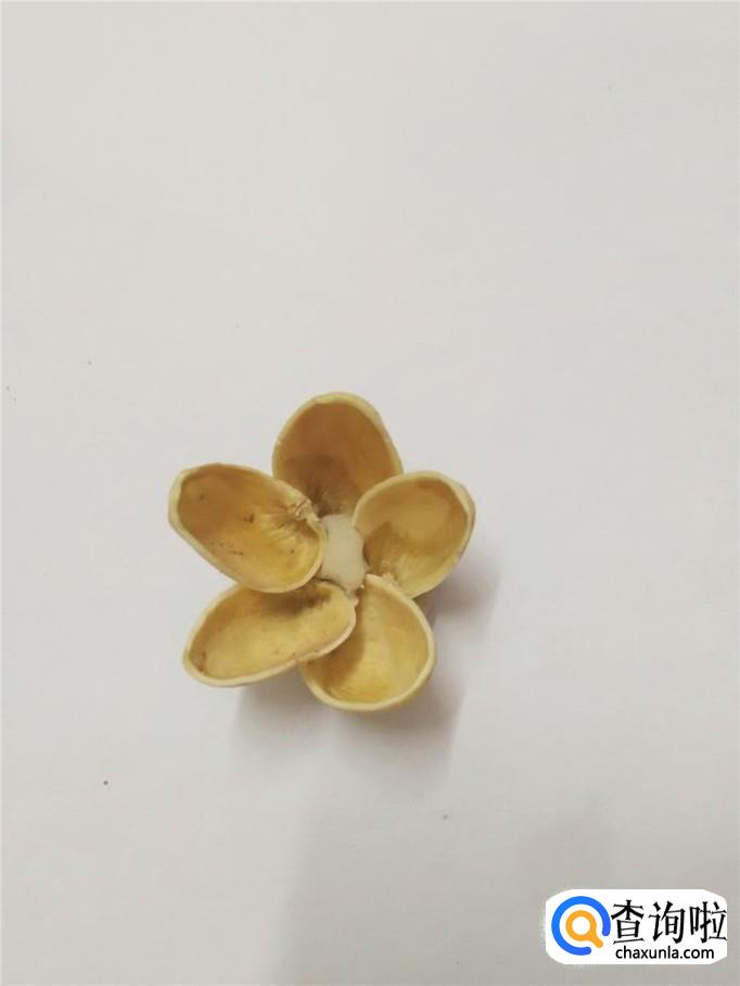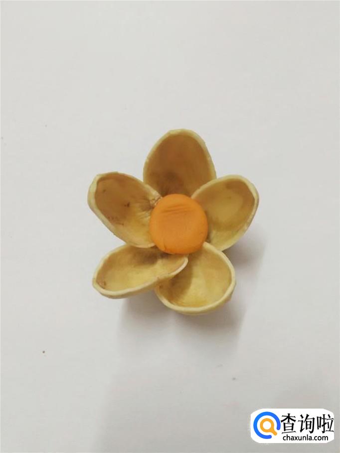把另外的四个开心果壳都插在花托上,五片花瓣组成一朵小花。