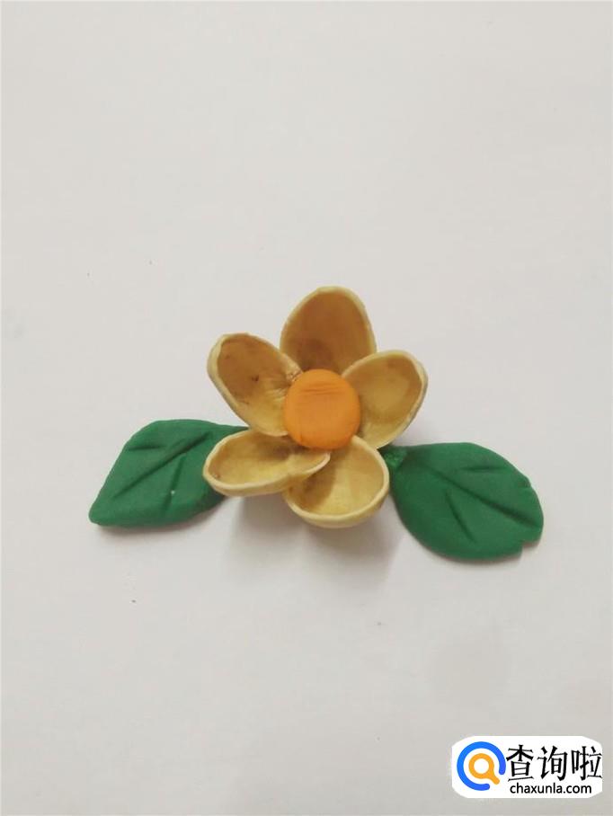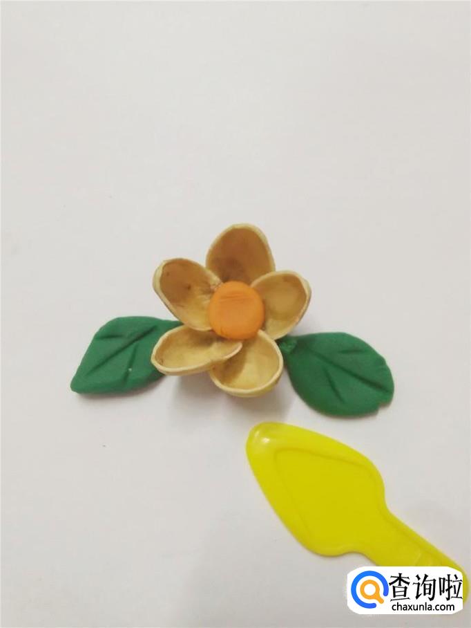 用一块桔色彩泥团成小球,再按成圆片,粘在花朵的中间,当作花芯。