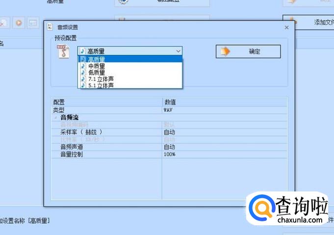 点击上方的“输出配置”,选择质量为“高质量”,然后点击确定,再点击右上角的“确定”,点击窗口上方的“开始”,几秒钟之后即可转换成功。