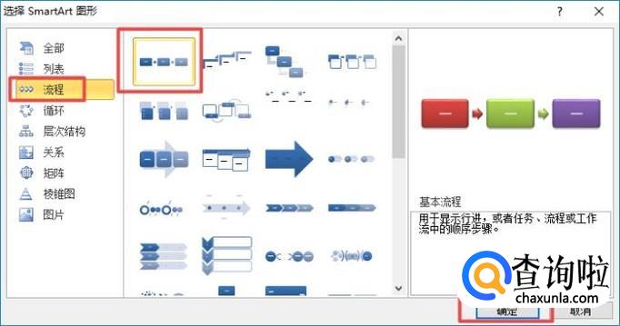 弹出的界面,我们点击流程,之后我们点击选择第一个,然后我们点击确定;