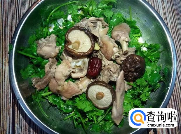 鸡肉、蘑菇、红枣、姜 、香菜、酱油、花生油