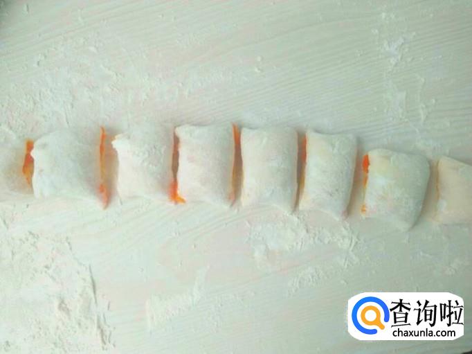 用手稍加拍一下,让其变得扁一点点,用刀切成一块块的小方块。