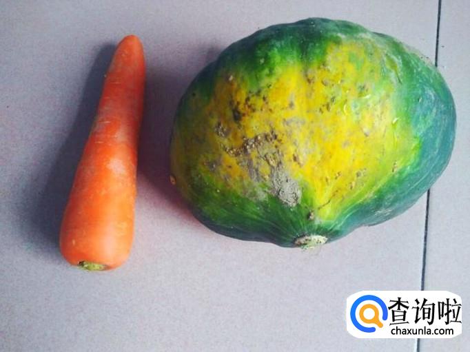准备一个南瓜和一根胡萝卜,这是刚刚从菜园子里摘下来的南瓜哦,虽然不是那种漂亮的橘黄色南瓜,但这是栗子南瓜,非常面,甜度也高,最适合小宝宝吃了。