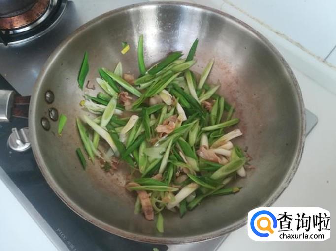 再把蒜苗段入锅,调大火翻炒,可稍微加一点清水,炒出来的蒜苗鲜嫩好吃。