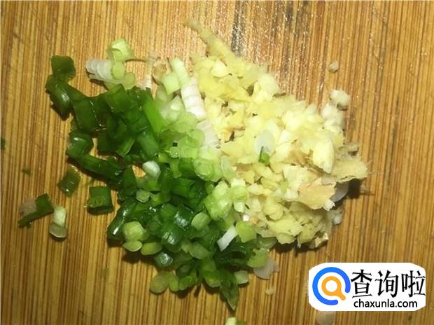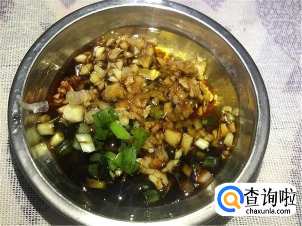 在煮汤的过程中,可以准备好一些酱料。准备两瓣蒜头,剁碎;葱清洗干净,甩掉水分,剁成葱末。再把蒜蓉、葱末一起放入小碟子中,加入适量的花生油、酱油、蚝油,搅拌均匀即可。