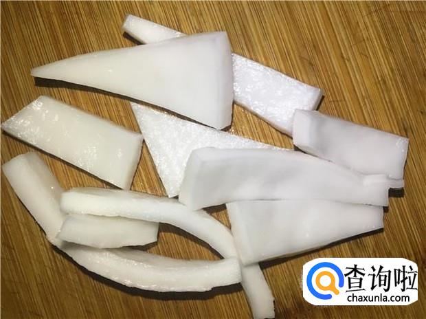 椰子去掉椰子皮,用刀子一点点弄干净表层的皮,然后清洗干净,切成片。