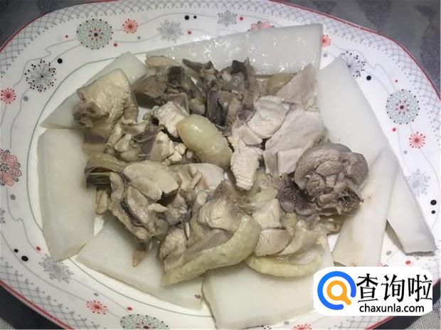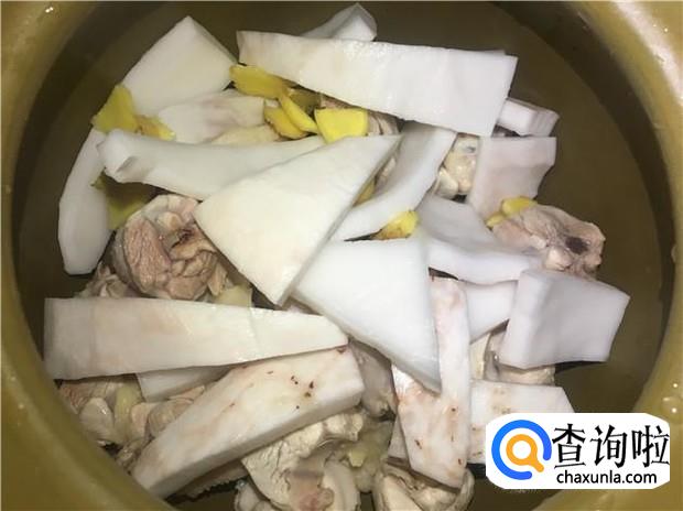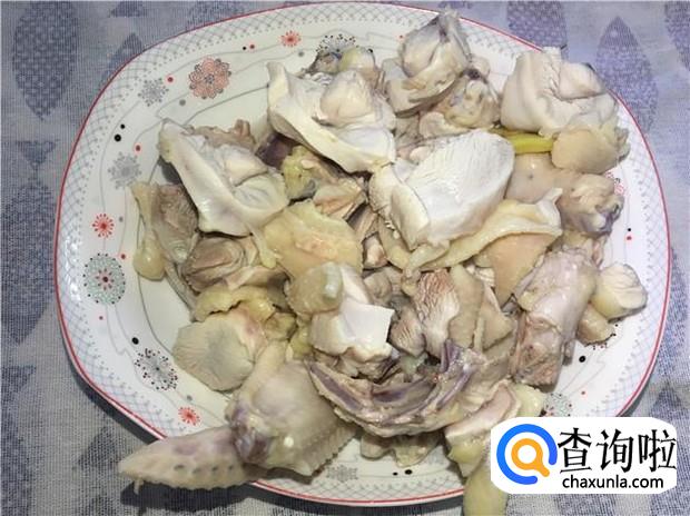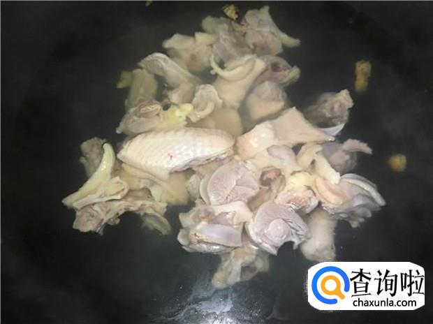 锅里放入几片姜,再放入适量的清水,大火煮开,然后把鸡肉倒入锅中,烫两三分钟,去掉血水和鸡的腥味。捞起来的鸡肉再用流动的水冲洗干净。