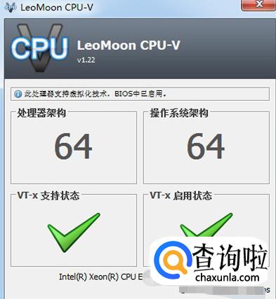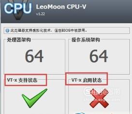 用leomoon cpu-v工具,检测电脑是否支持VT。如果您的电脑出现2个红色的“X”,则不支持VT技术;如果您的电脑出现1个红色的“X”,则可以启用您的VT功能。