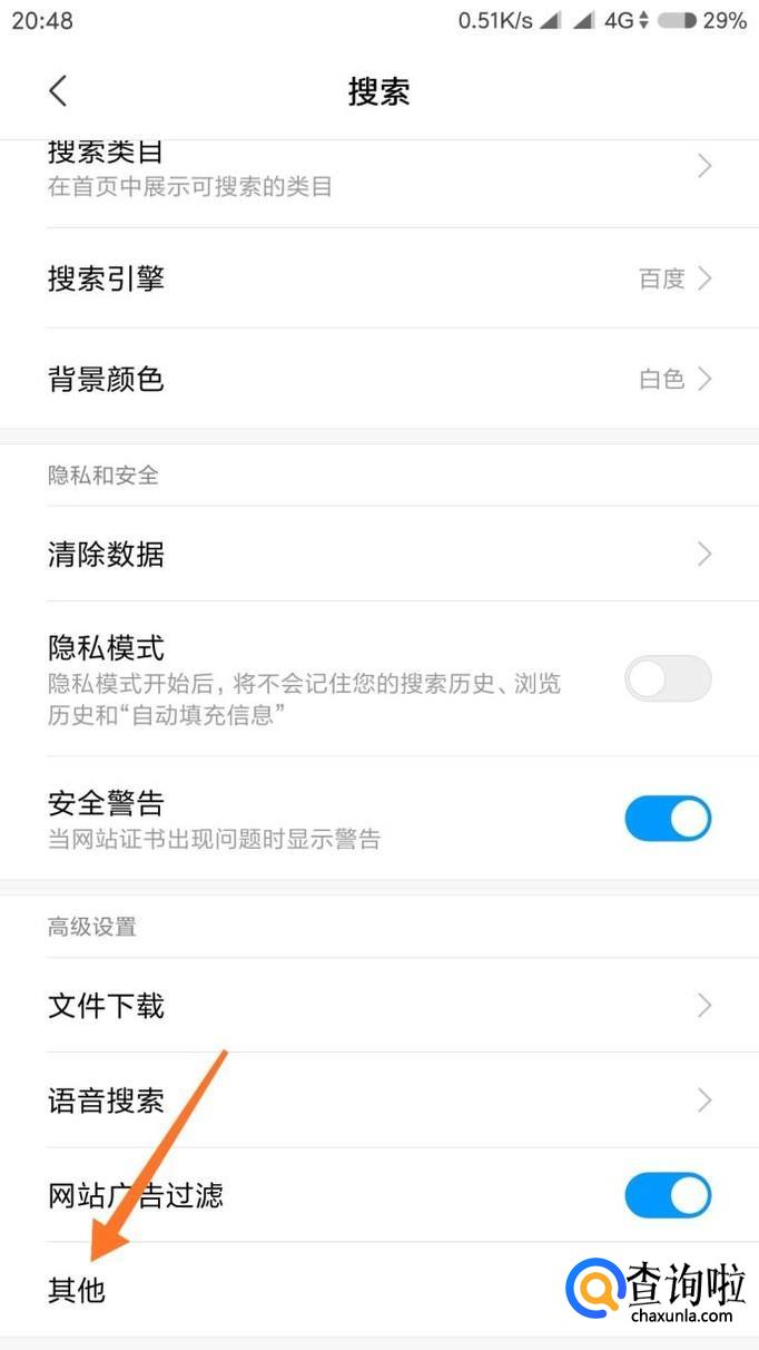 在设置里面一直向下拉,找到最下面的“其他”按钮。