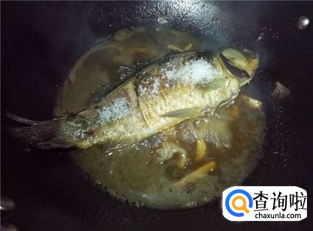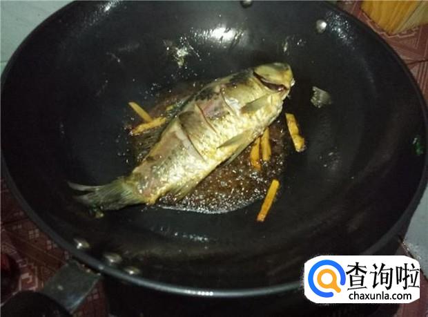 加入陈醋和老抽后,可以给鱼上色,再煎两分钟,然后加一碗清水。