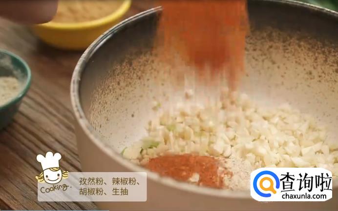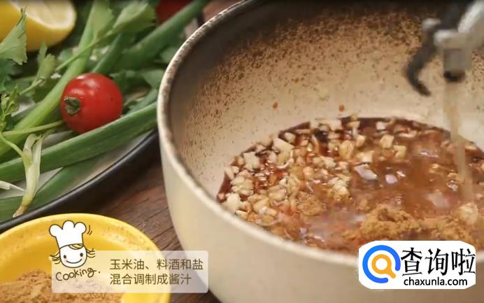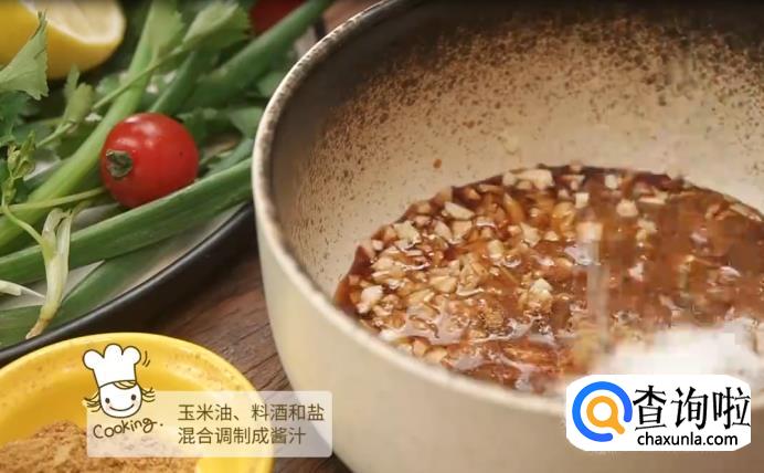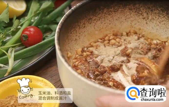 混合蒜末,孜然粉,辣椒粉,胡椒粉,生抽,料酒,玉米油和盐巴调制成酱汁。