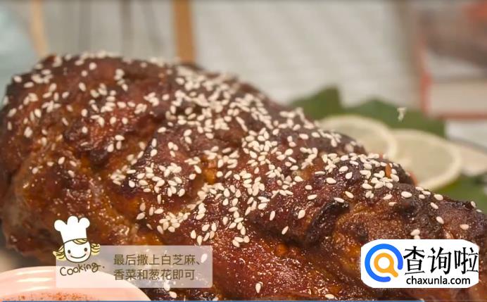 取出烤羊腿,再撒上白芝麻,香菜和葱花就完成啦。