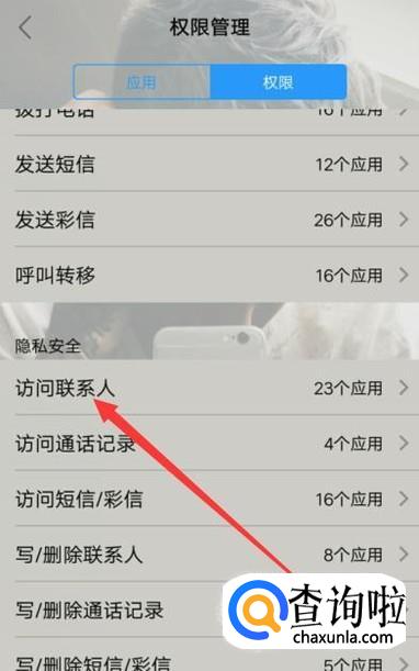 进入系统设置里面找到权限管理,选择“访问联系人”,点击并进入,如图所示。