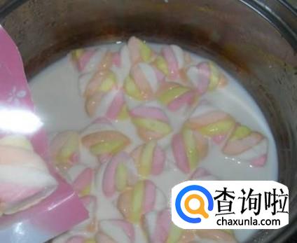 把牛奶倒入锅中,加入棉花糖,一起熬。