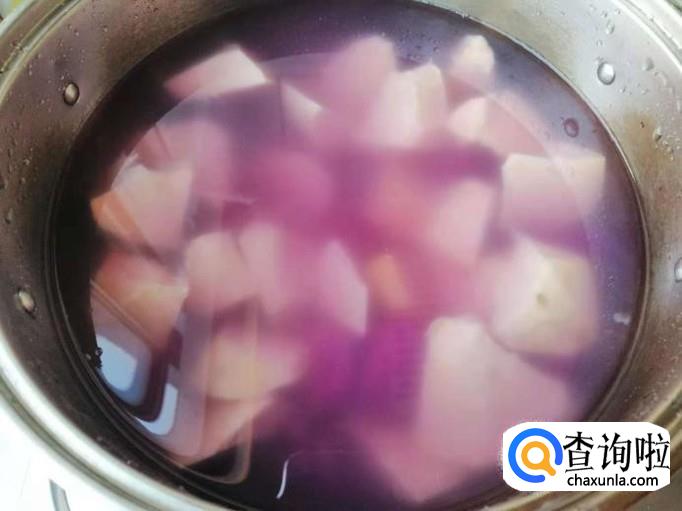 然后我们可以把地瓜先放到锅中,用大火开始煮地瓜和紫薯。一般加水是要没过地瓜和紫薯的。