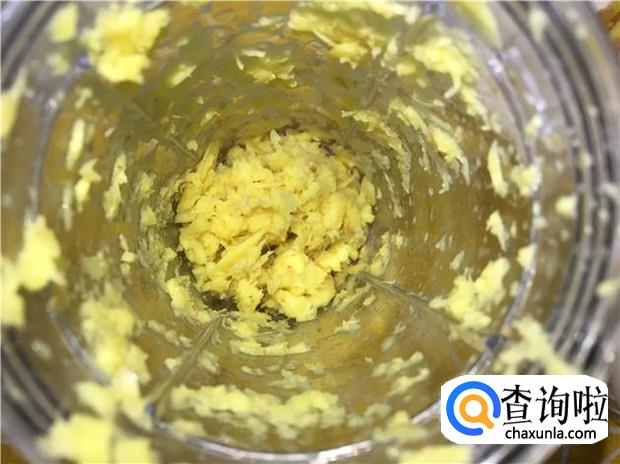 把姜片放入料理机中,均匀打碎。如果家里没有料理机的话,只能用刀子把姜给剁碎。