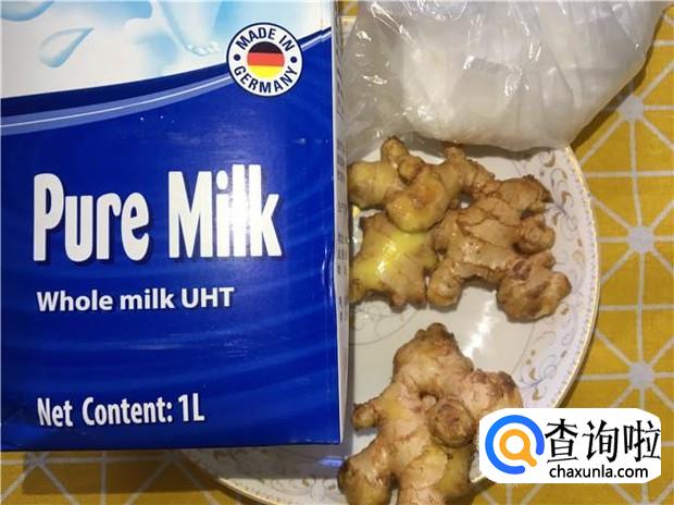 准备好做姜撞奶的菜谱:纯牛奶一盒,嫩姜适量,白糖三勺。