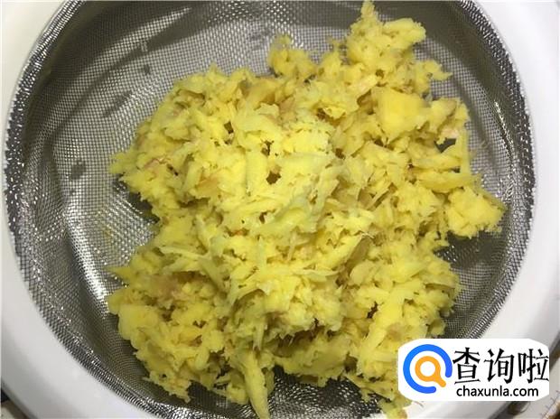 准备一个过滤网,把搅碎的姜放入过滤网中,用力把酱汁给挤到碗里。