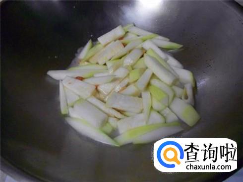 锅里倒上植物油,烧至七成热的时候,将葱段和姜丝放进锅里爆香,然后把切好的葫芦片放进锅里不断翻炒。