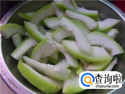 葫芦削皮之后对半切开,将里面的瓜瓤全部掏出来不要,然后清洗一遍,切成葫芦片,就像是切黄瓜片一样一样的哈。