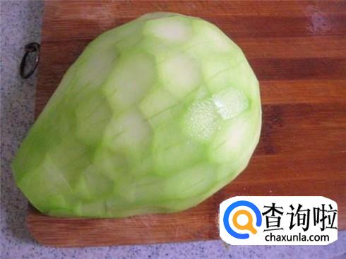 绿葫芦摘下来之后,用刀将葫芦的皮全部削掉,因为还没有成熟,所以不要担心葫芦的皮不好削,很轻松就能削干净哦。
