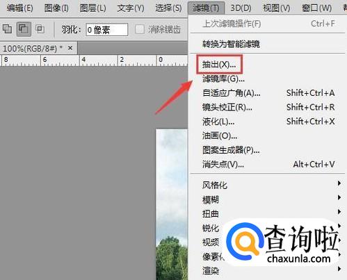 使用ps将我们的图片素材打开,然后在滤镜菜单里找到抽出选项,如图所示:
