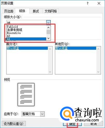 弹出的界面,我们点击纸张大小边上的下拉箭头,弹出的界面,我们根据我们的需求选择其中一个纸张,缩放设置其实就是根据我们的纸张大小来设定的,纸张越大也就越小,之后我们点击确定就可以了。