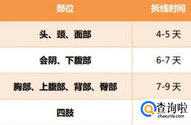 面颈部4-5天拆线;下腹部、会阴部6-7天拆线;胸部、上腹部、背部7-9日;四肢10-12天,近关节处可延长一些。