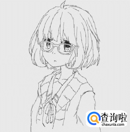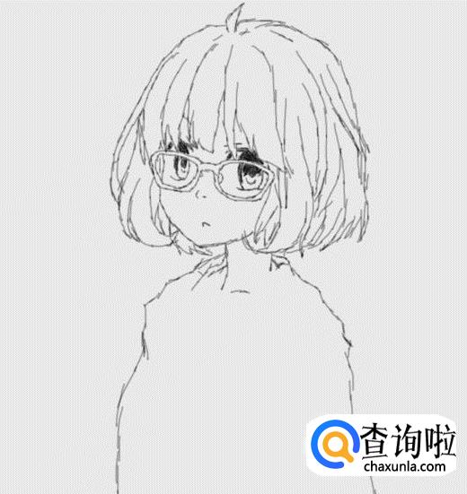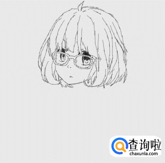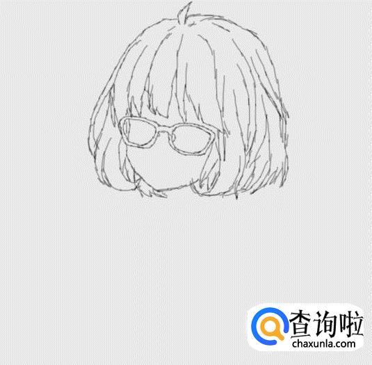 在头发的基础上画出动漫人物的面部,然后在面部上画出人物戴的眼镜,如图所示:
