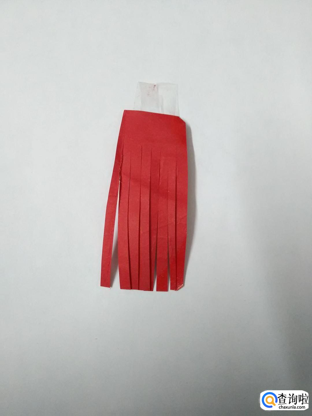 再从边角料上剪一个粗一些的长方形,一端用胶带粘好,另一端用剪刀剪成许多细细的小条,当作灯笼穗。