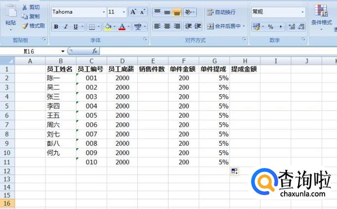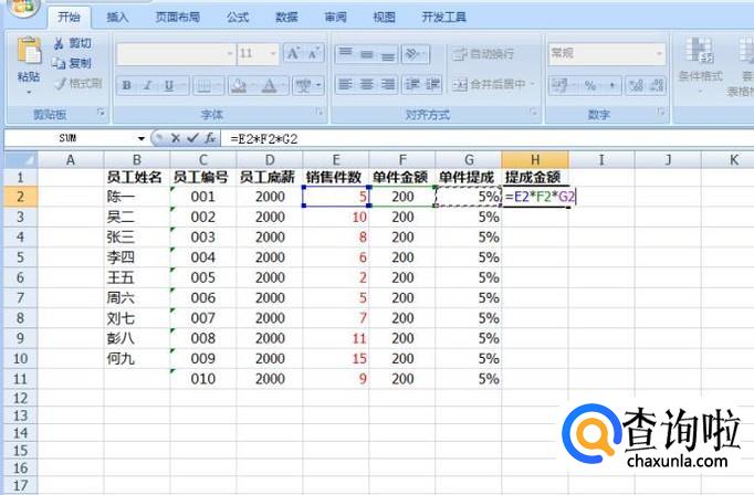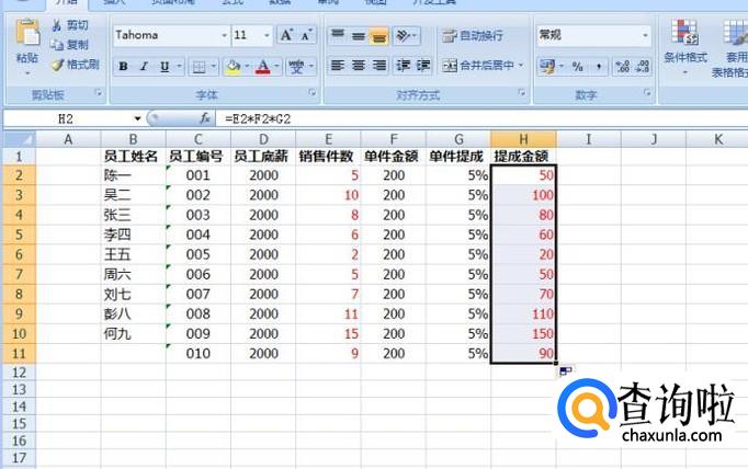 销售件数这一栏,填入每一位员工成功销售了多少件商品,然后提成金额这一栏中是把销售件数、单件金额、单件提成这3个数据相乘,就得出了最后的提成金额。