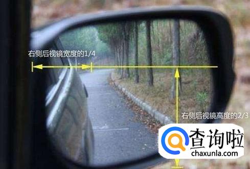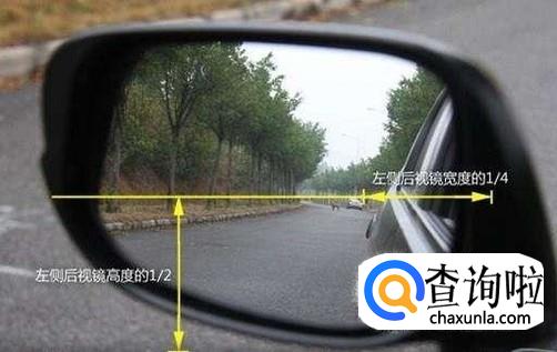左侧后视镜调整:把水平线置于后视镜的中线位置,然后再把车身的边缘调到占据镜面影像的1/4。