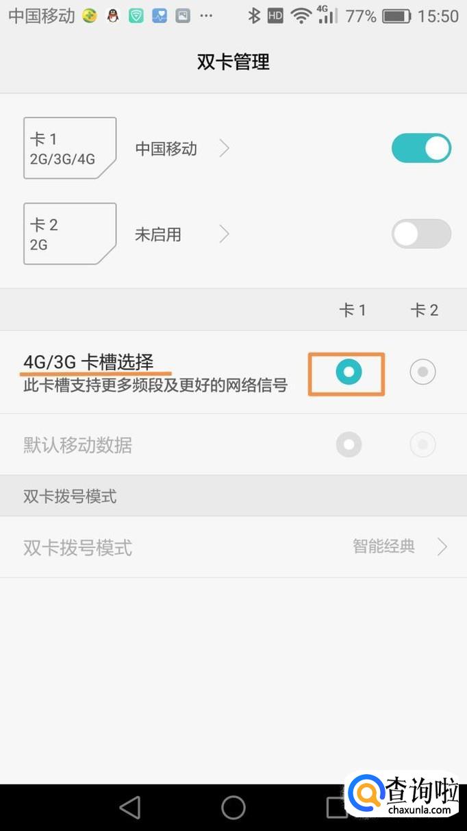 然后在双卡管理界面中为任意一张手机卡选择4G卡槽,也就是这张卡将会优先使用4G网络。
