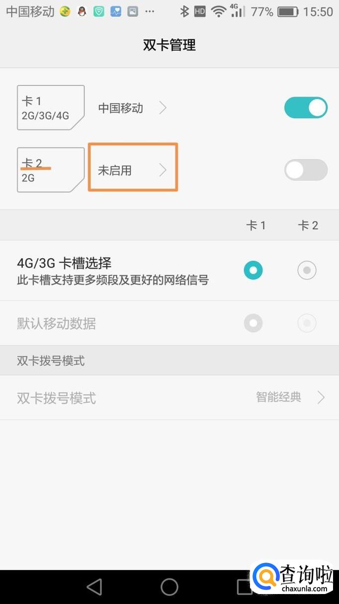 如果手机中安装了两张卡都需要使用网络,那就将两张卡都启用,然后选择4G卡槽。