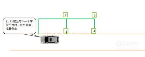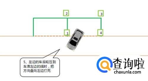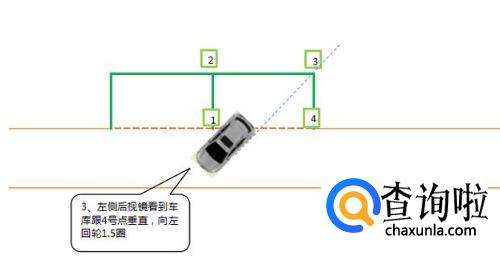 当左侧后视镜看到车库跟4号点垂直(右后角时),向左回轮1.5圈,继续倒车。
