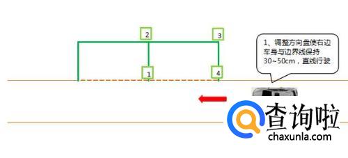 进入侧方位停车考试区域后,左右调整方向盘使右边车身与边界线保持30~50cm,直线行驶。