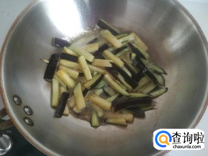 再把茄子条入锅炸软,用漏勺捞出沥油。