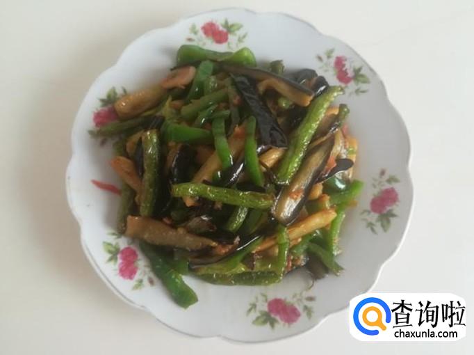 然后用锅铲铲出,盛入盘子里,这样素烧茄子豆角青椒就做好了。