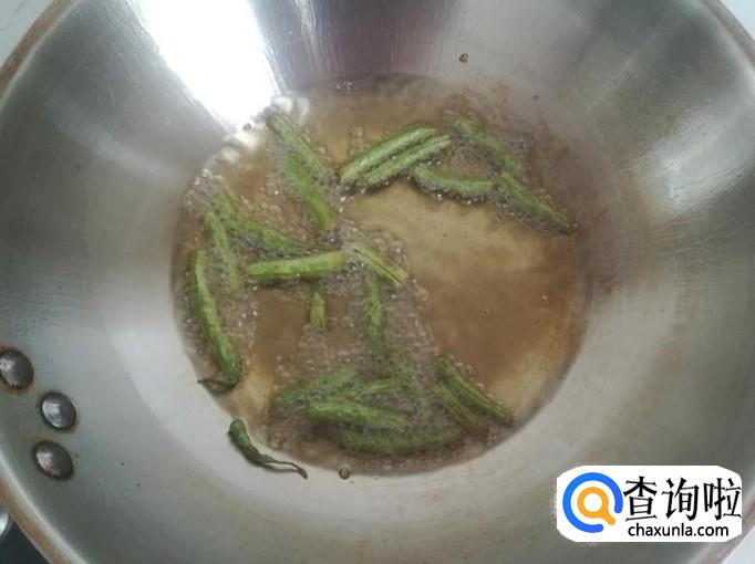 炒锅里放入多点花生油,油热后,把豆角入锅炸软,用漏勺捞出沥油。