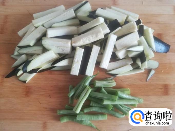 把茄子去蒂切成条,豆角去筋掰成小段。