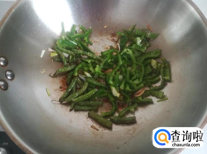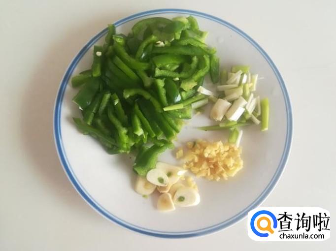 把青椒去蒂切成条,葱切葱花,姜切末,蒜切片。