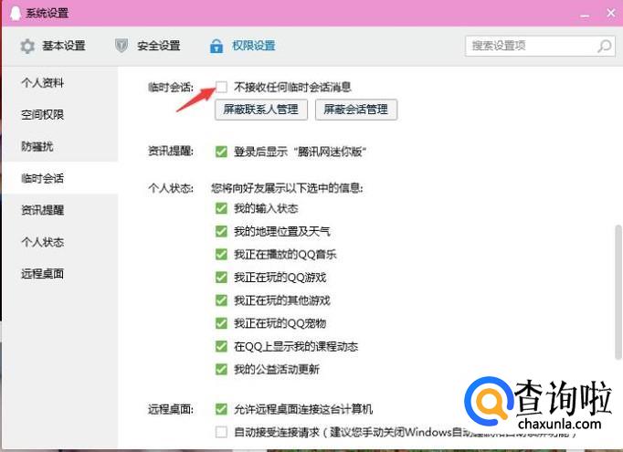 点开隐私设置后最上方的功能就是临时会话,勾选一下不接受临时会话,那么别人就没办法邀请你加入临时讨论组了。