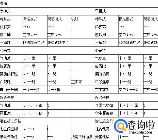 拳皇wing1.91春丽表里模式出招表,如下: