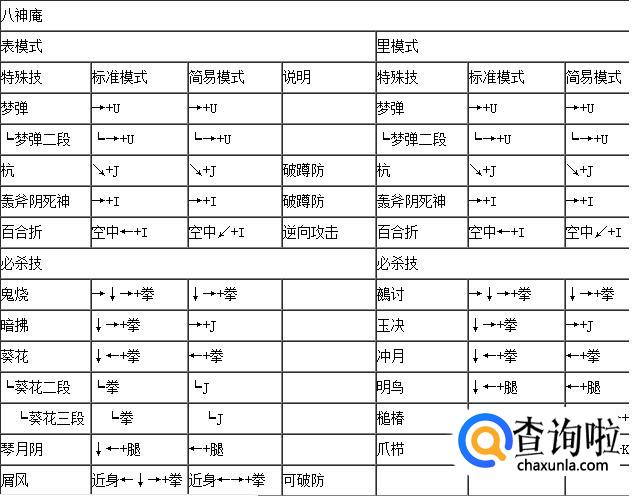 拳皇wing1.91八神庵表里模式出招表,如下: